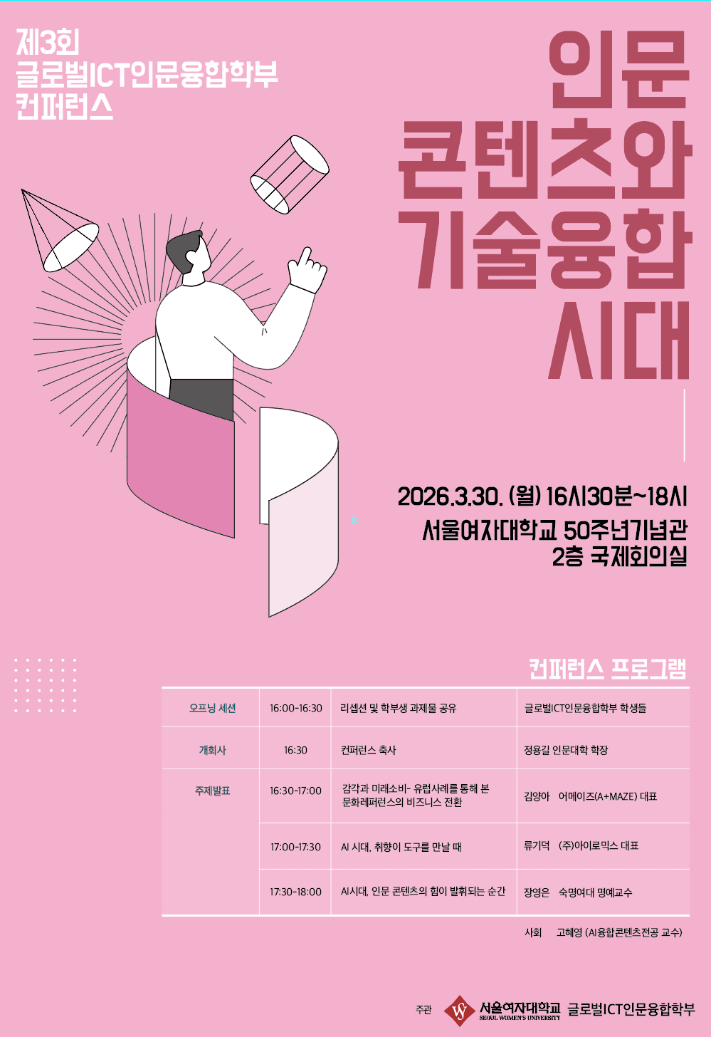 인문콘텐츠와 기술융합 및 인재양성에 대한 비전을 이해하고, 전공 분야에 대한 안목을 넓힐 수 있는 강연으로 구성되어 있는 본 컨퍼런스 행사는 글로벌ICT인문융합학부 재학생들과 학부 소속 교수 외에도 인문 콘텐츠와 기술융합 분야에 관심이 있는 교내외 구성원 누구나 참석할 수 있습니다.